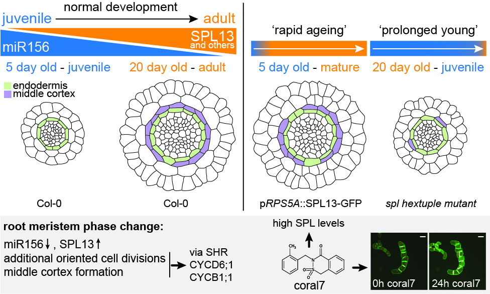 Oriented cell divisions are crucial to determine the overall morphology and size of plants, but what controls the onset and duration of this process remains largely unknown. We recently identified a small molecule which activates root meristem expression of SQUAMOSA PROMOTER BINDING-LIKE13, a known player in the shoot juvenile to adult transition. This leads to oriented cell divisions in the root meristem via SHORT ROOT and cell-cycle regulators. We further show that the root meristem has distinct juvenile and adult phases typed by morphological and molecular characteristics and that SPL factors are crucially required  for this transition in Arabidopsis and rice. In summary, we provide molecular insights into the age-dependent morphological changes occurring in the root meristem during phase change. The root meristem aging research team currently consists of Veronika Jirásková and Elisa Drijvers.